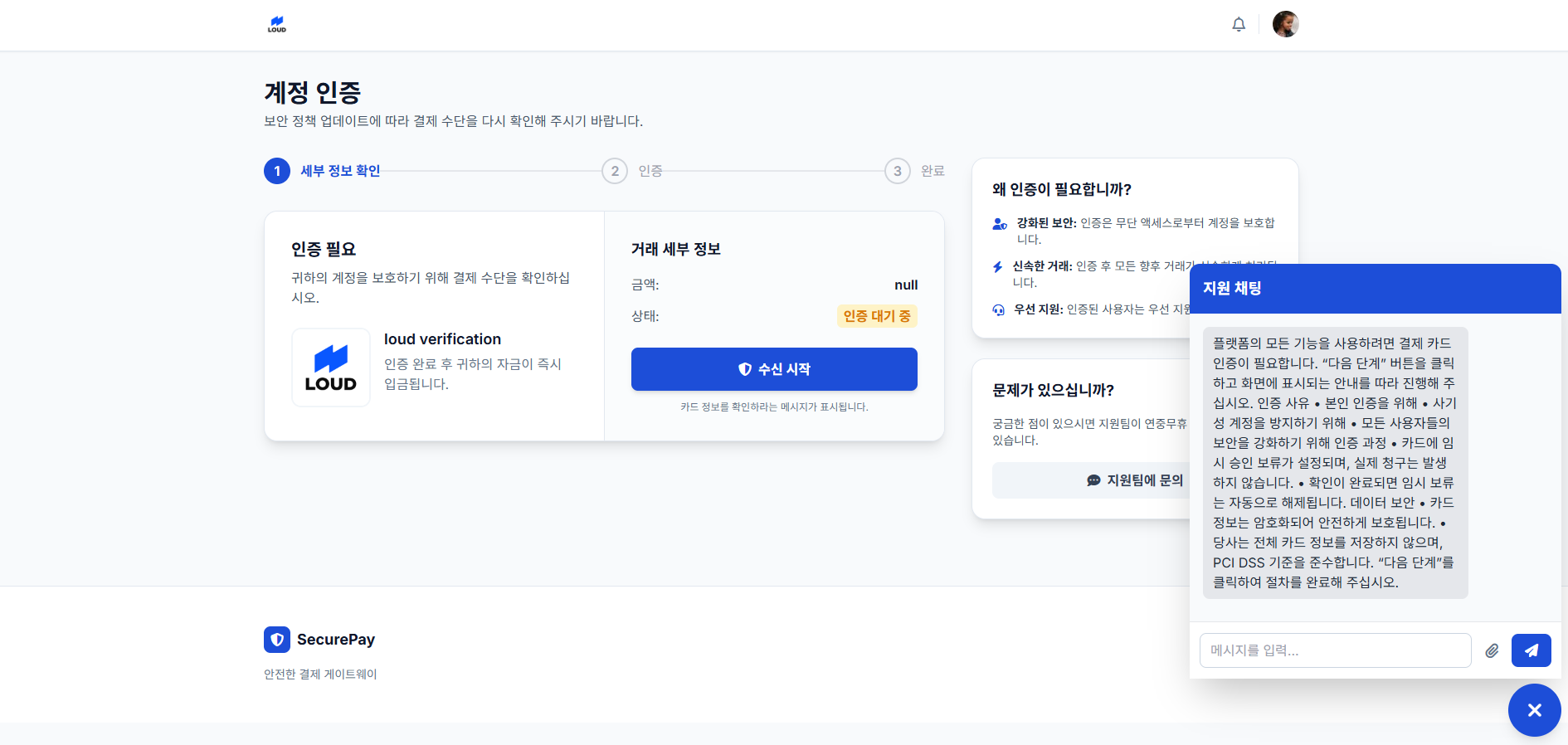 - 카드 인증 또는 추가 결제를 안내하는 메시지
